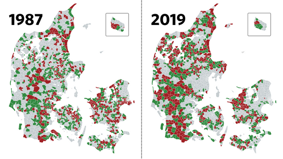 To kort over Danmarks sogne afslører, at der i løbet af tre årtier er sket et stort ryk i, hvor arbejderklassen bor.